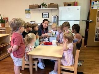The Montessori curriculum was designed with sensitive periods in mind. We focus on care of self and care of environment, relying on the toddler’s “do it myself” mode of thinking to increase their own independence. A simple lesson, setting one’s place mat for snack, has a rhythm, sequence and order. It builds throughout the year into a full sequence of preparing and serving the snack, staying seated to eat the snack, cleaning off one’s plate when finished, wiping off the place mat, returning items where they belong, washing the dishes, washing the cloth napkins, hanging them to dry, ironing and folding the napkins, and finally, preparing the shelf of table setting for the next day.